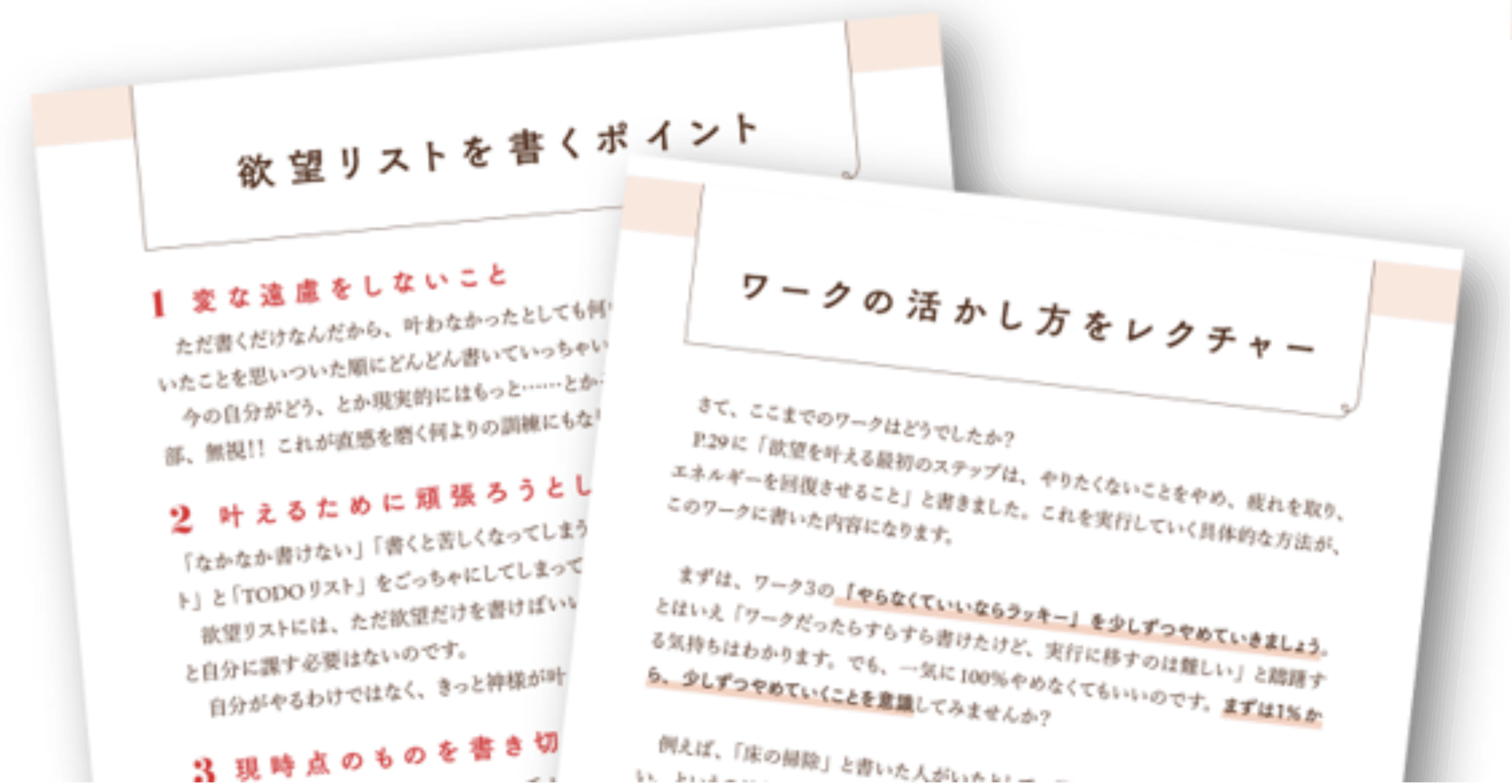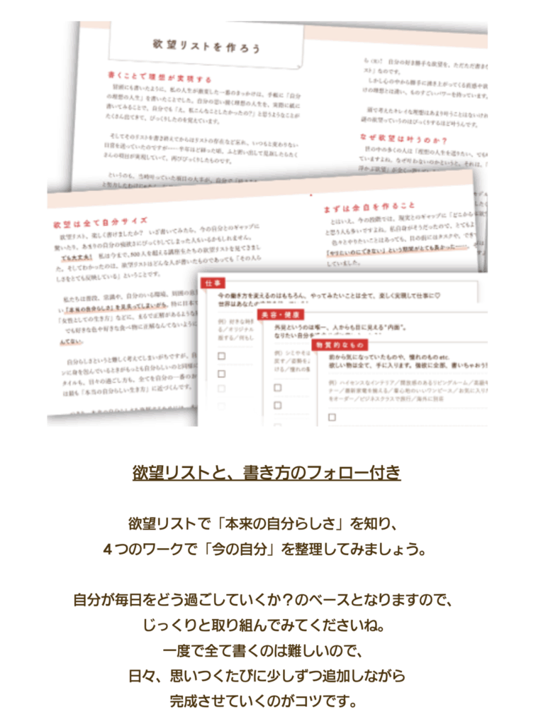 講座とワークでは欲望について徹底的に向き合いどんどん欲望が出てくるようになりました。それを付属の欲望全開手帳に書くことで。不思議と叶うようになっていったんです。